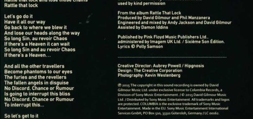 Die Rückseite der „Rattle That Lock“ Promo-Single gibt neben dem kompletten Songtext die Namen der mitwirkenden Musikern bekannt. Guy Pratt spielt Bass, das überrascht...