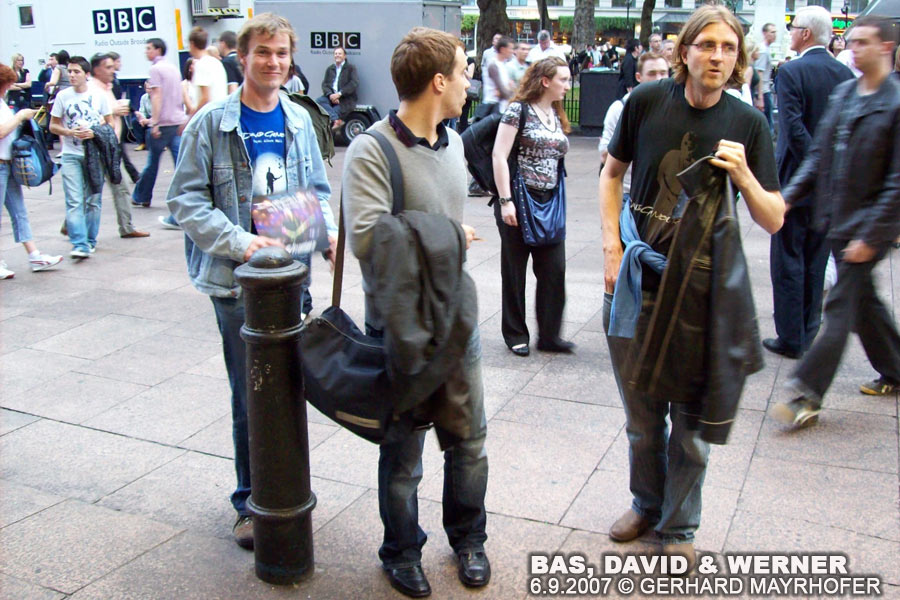 Um 16:30 Uhr kamen Gerhard Mayhofer, Bas Swanenberg und ich beim Odeon Theater an. Drei sehr große David Gilmour Werbebanner schmückten das Odeon. Der kleine Park inmitten des Leicester Square war mit Menschen gefüllt, und wir sahen Gavin Elder mit seiner Kamera, wie er gerade Fans interviewte. Die BBC hatte einen Übertragungswagen vor dem Kino abgestellt, und ein Kamerateam überprüfte gerade ihre Ausrüstung. Danach begrüßte mich Frank. Er hatte am Nachmittag Gilmour, Polly und die Band persönlich getroffen.