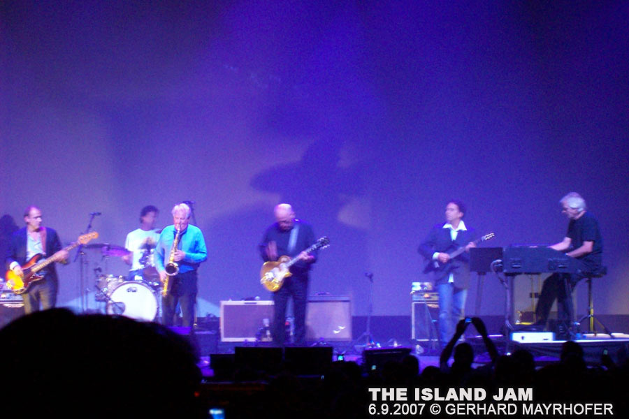 Ich sagte noch zu Bas: „Ich glaube, dass Gilmour heute entweder einen neuen Song oder den Island Jam spielen wird!“ Dass meine Prophezeiung eintraf, überraschte mich trotzdem einigermaßen. Gilmour fing schon an, auf seiner Gibson-Gitarre zu spielen, während Phil Taylor und die Crew noch damit beschäftigt waren, das restliche Equipment auf die Bühne zu bringen. Das Schlagzeug und das Keyboard wurden auf die Bühne geschoben. Gilmour: „Wie werden jetzt einen Jam für euch spielen!“ Schließlich bat er die anderen Musiker auf die Bühne, als dann zuletzt noch Rick Wright auf die Bühne kam, gab es tosenden Applaus.