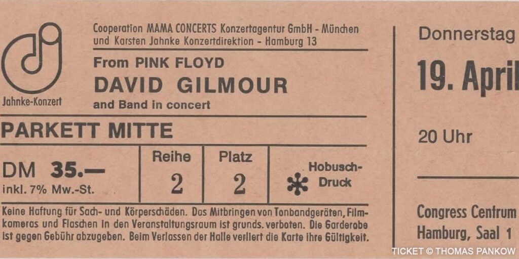 Vor 42 Jahren saß ich mit meiner Schwester in Hamburg im CCH und erlebte David Gilmours Auftritt. Vor dem Konzert war ich voller Vorfreude und Spannung, wie es wohl sein würde ihn mit anderen Musikern seine Soloalben spielen zu hören und zu sehen. Ende Februar hatte ich die Maxisingle Blue Light gekauft und wenig später, Anfang März, das damals neue Album About Face. Ich kann mich noch erinnern, dass es in der Musikpresse nicht so positiv rezensiert wurde und es Thema war, ob es nun Ähnlichkeiten mit dem »Pink Floyd Sound« gab oder nicht.