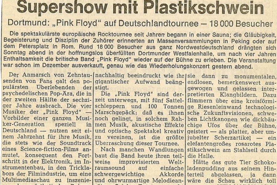 Vor 40 Jahren tourten Pink Floyd mit ihrer bisher größten und aufwendigsten Produktion durch Europa. Die zweimonatige Tour umfasste 29 Hallenkonzerte! Mit jeweils 9 Shows spielten Pink Floyd mehr als die Hälfte ihrer Konzerte in Deutschland und England! Der Tourstart fand am 23.1. in der Westfalenhalle in Dortmund statt. Das letzte Konzert der Europa-Tour spielten Pink Floyd am 31.3. in der englischen Heimat in der New Bingley Hall in Stafford.