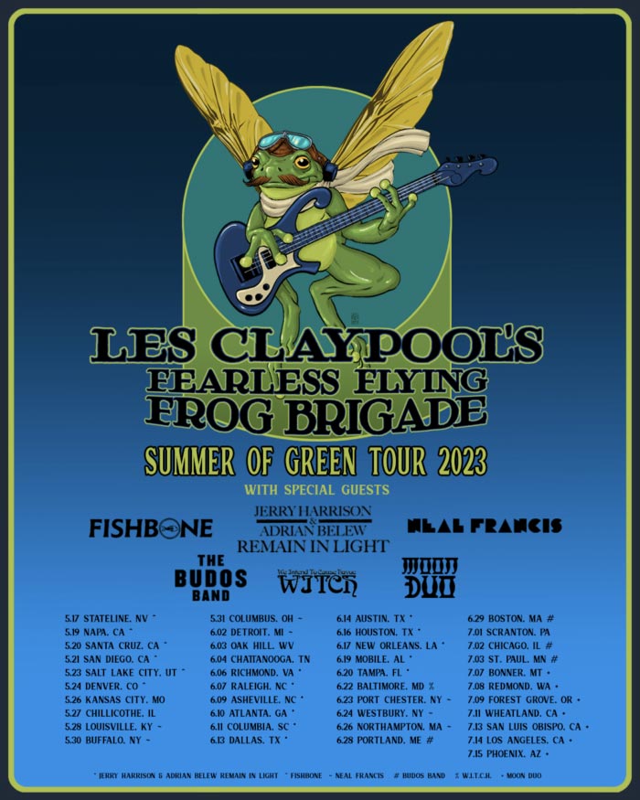 Les Claypool bringt nach 20 Jahren die Fearless Flying Frog Brigade zurück und tourt diesen Frühling und Sommer durch die Vereinigten Staaten. Auf der 41 Konzerte umfassende Reunion-Tour wird Pink Floyd’s ‘Animals’ Album komplett gespielt. Cool und mit von der Partie ist Harry Waters am Keyboard!