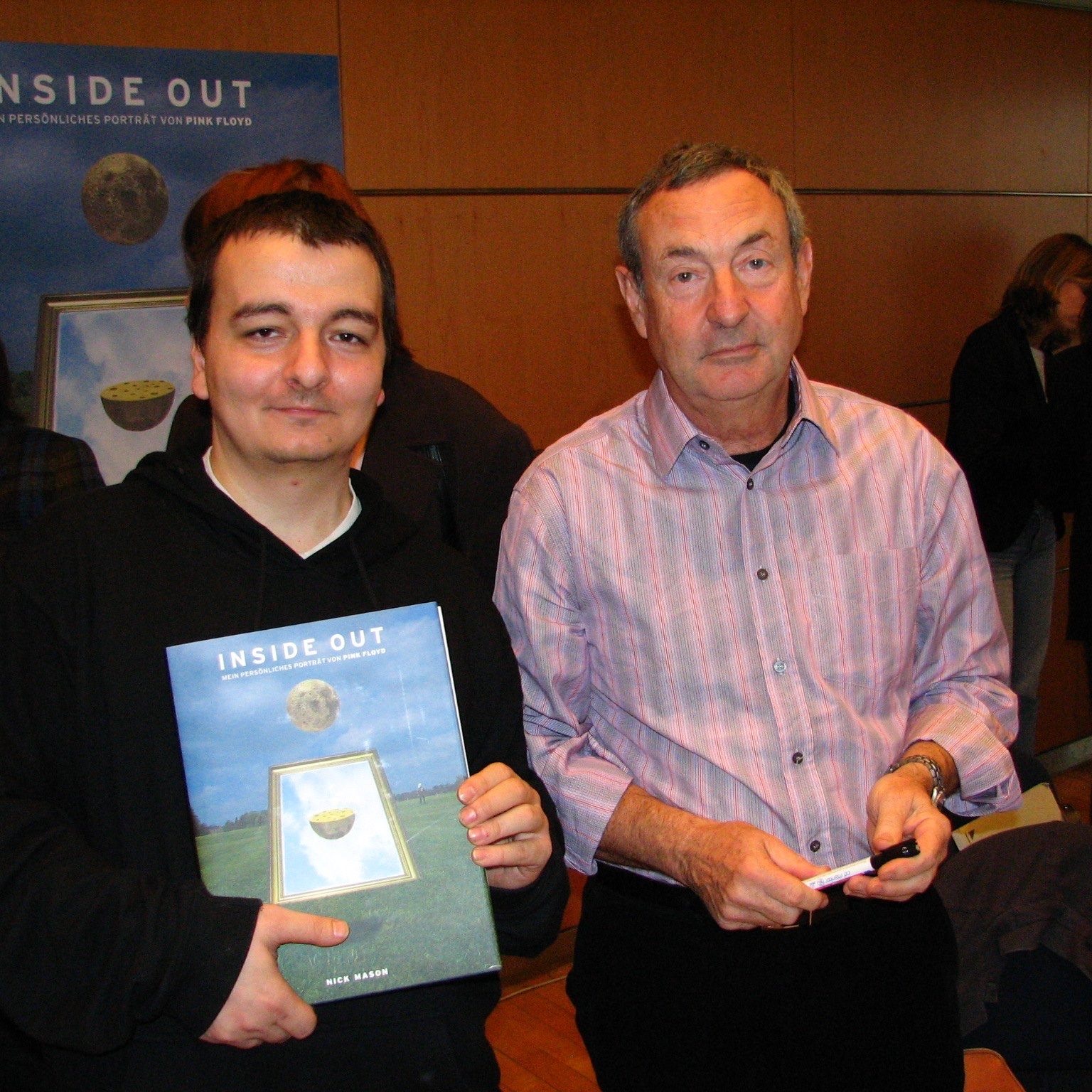 Im Folgenden gab er brav Autogramme und da muss ich allen Dränglern am Tisch eine Rüge erteilen! Es wurde ganz klar gesagt, dass jeder seine (bis zu drei) Autogramme bekommt, aber trotzdem wurde gedrängelt und gedrückt, als gäbe es am Tisch zwei Karten für Pink Floyd. Aus gutem Grund hatte ich vorher meine Pink-Vinyl-Animals zu Hause gelassen und nur die Plattenhülle mitgenommen. Letztere musste bei diesem Gedränge ganz schön leiden. Dafür freue ich mich nun, dass sie signiert ist und in meinem Inside Out nun steht: To Jens – Nick Mason. Und ich bin stolz, dass ich zu dieser Stunde der zerstreuten Floyds immerhin drei Pink Floyd Mitglieder in einer Woche erleben durfte. Der vierte folgt im Juni… Which one is Pink?