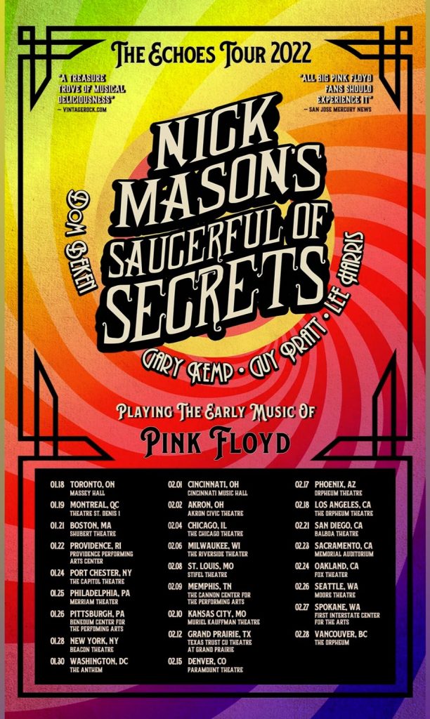 Schöne Nachrichten kamen heute aus dem Hause von Nick Mason und seinen Mannen den Saucers! Sie touren 2022 wieder in Nordamerika. Drei Auftritte in Kanada und 23 Shows in den United States of America macht alles zusammengerechnet 26 psychedelische Konzerte. Der Ticketverkauf startet Freitag am 29. Oktober.