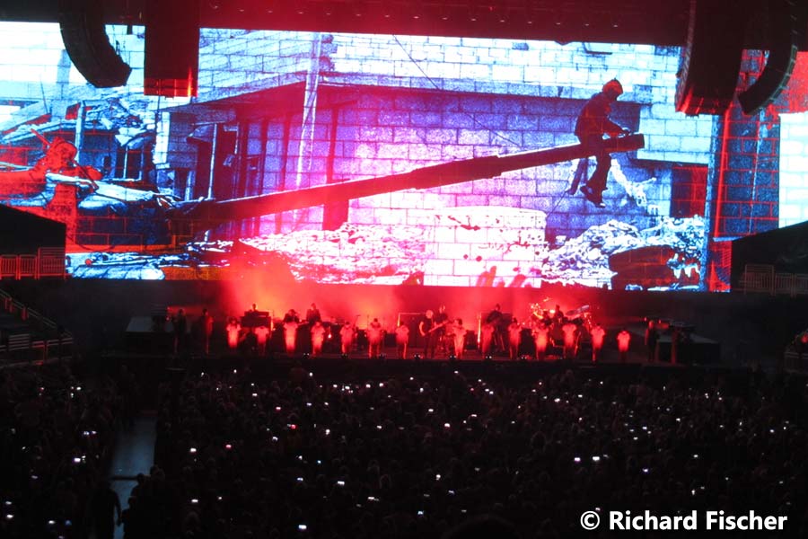 - Die neuen drei Songs fügen sich sehr schön ein und fühlen sich recht wohl…;-)) – sind auf jeden Fall keine Fremdkörper, ich meine auch deswegen nicht, weil hier Waters zurück zu seinem alten Stil gekommen ist. Werden vom Publikum warm und freundlich aufgenommen, definitiv mehr als Anstands-Applaus. Thematisch fügt sich das Trio naturgemäß in den Kanon ein als ob sie schon lange da wären nur halt jetzt „aufgerufen“ wurden…