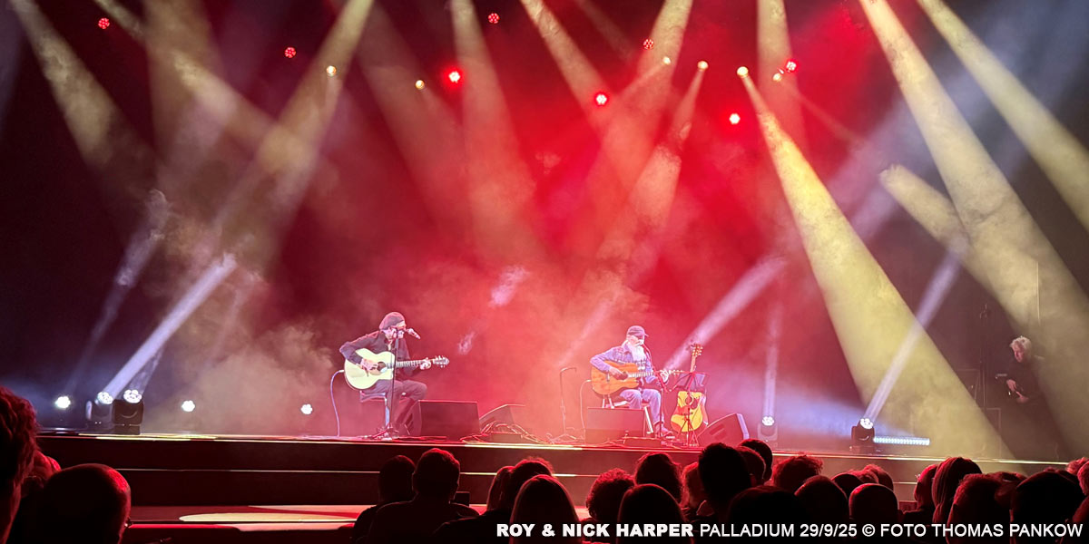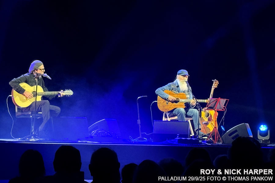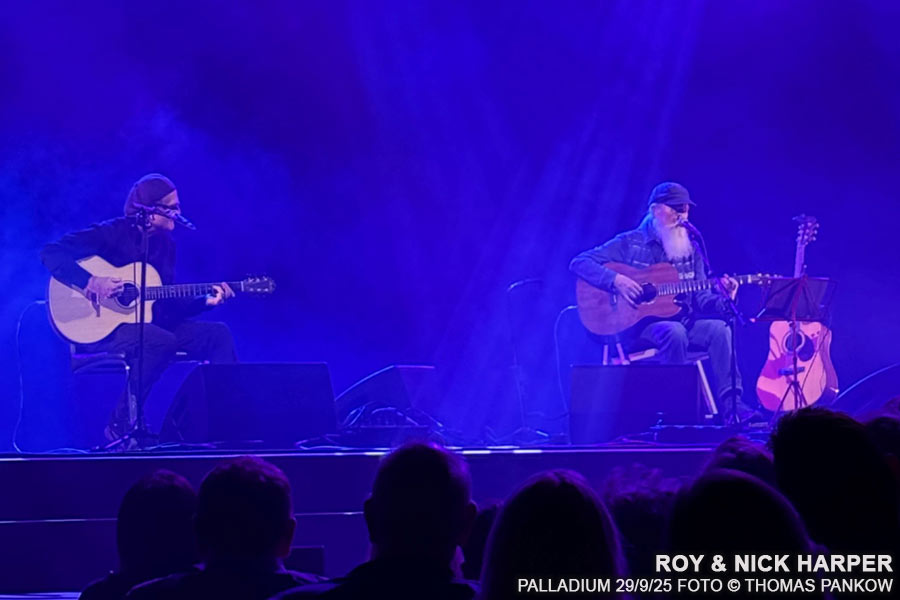 Die Songs, ergänzt oftmals vom Gitarrenspiel seines Sohnes Nick, wurden mit Leidenschaft vorgetragen. Und das letztlich mit 84 Jahren! Außer, dass Roy das ganze Konzert auf einem Stuhl saß (das tat auch Nick), war ihm das Alter nicht anzumerken, großartiges Gitarrenspiel, toller Gesang und von seinem Sohn ein sehr virtuoses Gitarrenspiel. Beide gingen im Konzert immer sehr humorvoll miteinander um.