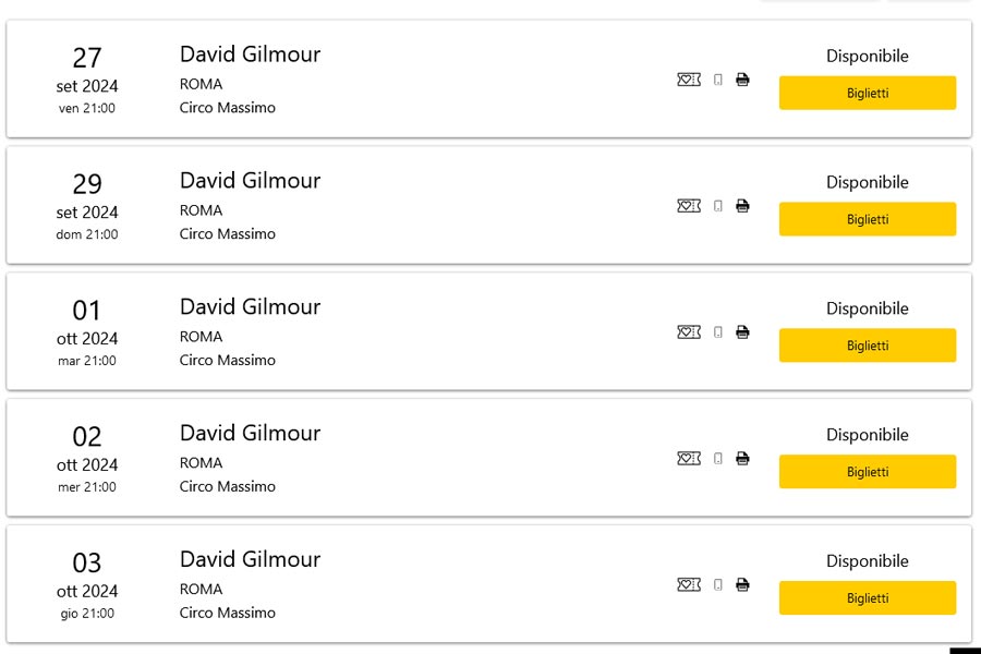 Es gibt seit Kurzem wieder Tickets für die folgenden David Gilmour Rom-Konzerte: 27.9., 29.9., 1., 2. und 3.10.!