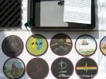 UNTERSETZTER: 9 „Bierdeckel“, die auf einer Seite Thorgerson Entwürfe und auf der anderen einen Buchstaben zeigen. Wie könnte es anders sein, ergeben alle Buchstaben zusammen: PINK FLOYD.