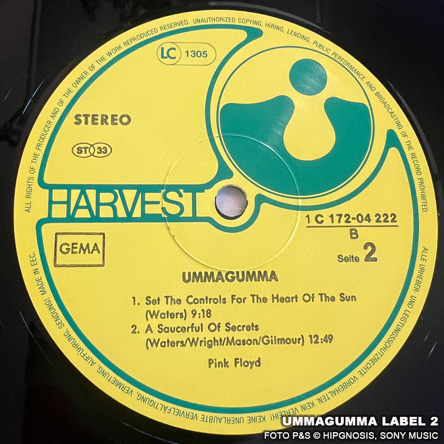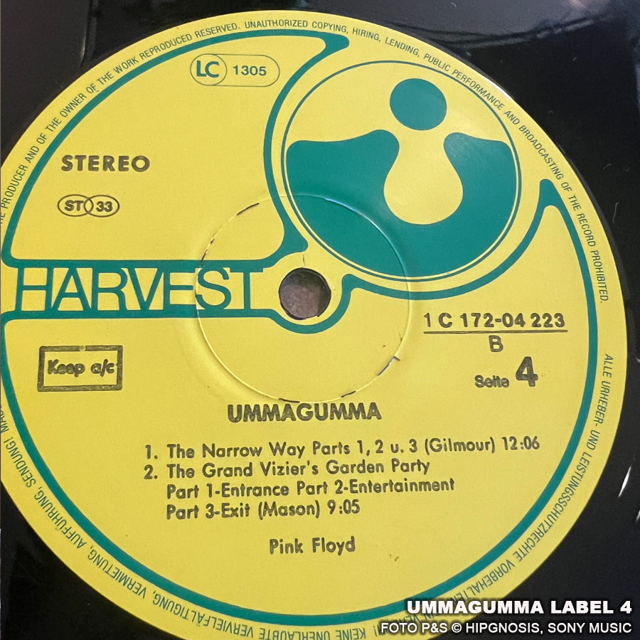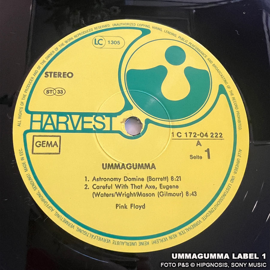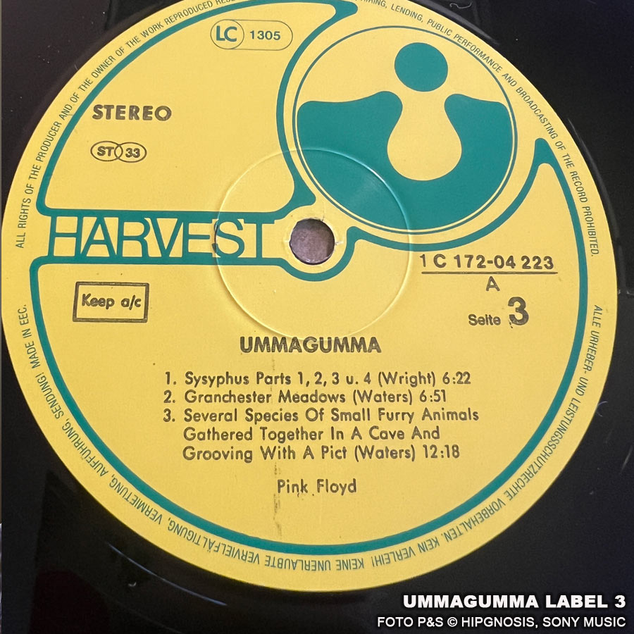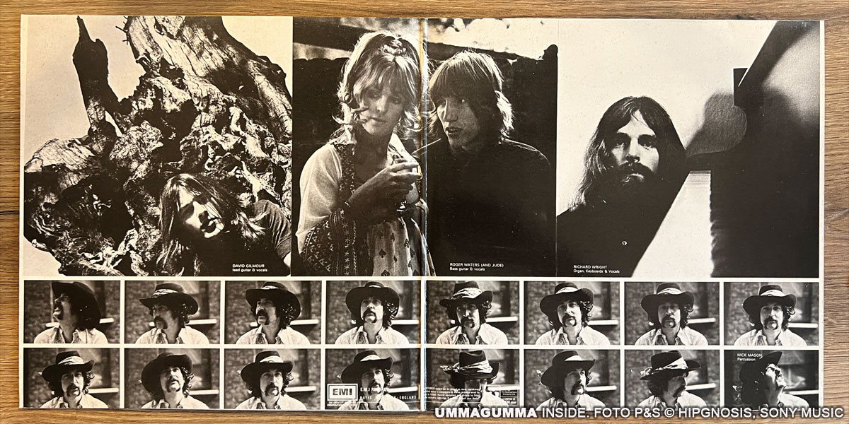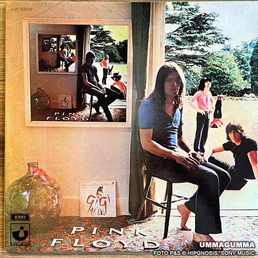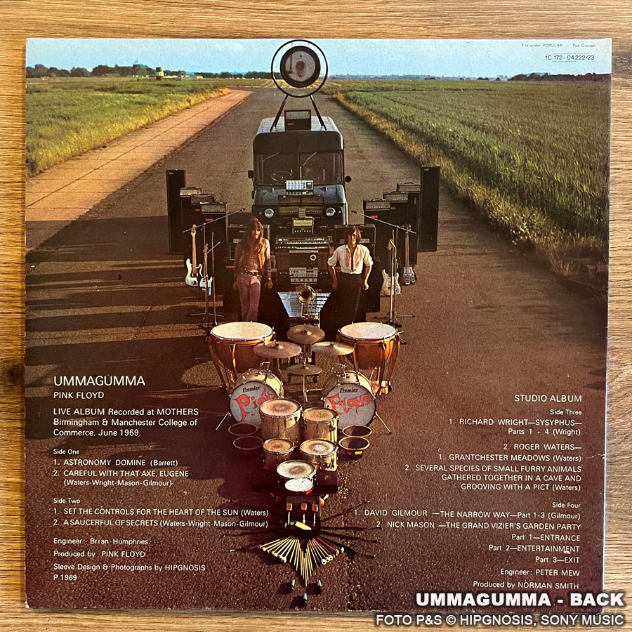 Das Album Ummagumma war schon eine verwegene Idee von Pink Floyd. Es besteht aus einem Live- und Studioalbum, das Kompositionen und Performances von jedem einzelnen Bandmitglied enthält. Ummagumma war das erste Doppelalbum von der Band. Auf dem Backcover sind Pete Watts und Alan Styles zu sehen. Ich besitze einige Ummagumma Versionen. Die Fotos stammen von einer Reissue 1977 mit den Labelnummern 1C 172-04 222/23.