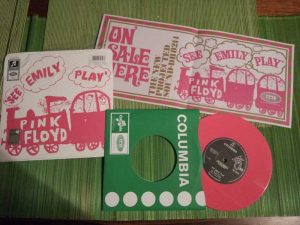 In einer eingeschweißten Kartonhülle mit dem Original ‚See Emily Play‘ Design von Syd Barrett finden sich das Original-Werbeposter und eine ziemlich schwere 45“ Single in Pink-Vinyl. Kleines Loch.