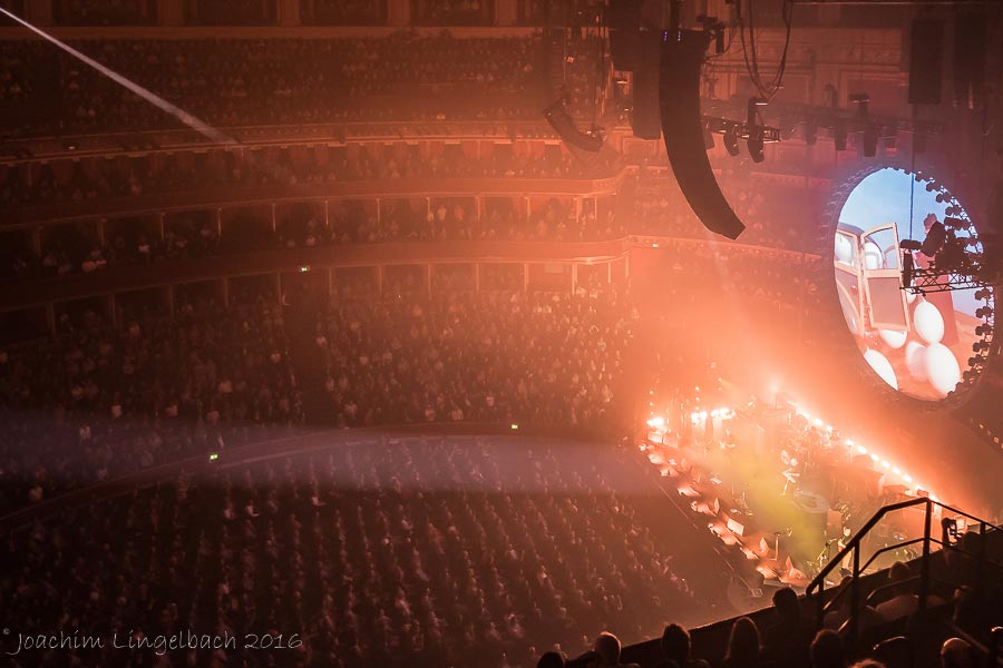 David Gilmour 2016, Konzert 2 von 5 in der Royal Albert Hall. Die Lage meines Sitzplatzes war großartig. Ich saß den Sängerinnen und Guy Pratt sehr nahe und hatte eine tolle Sicht auf David Gilmour. Gleich zur Setlist! Us and Them wurde erstmals in Hälfte zwei anstatt The Girl in the Yellow Dress gespielt. Great Gig und One of these days waren wieder gesetzt. Die Stimmung in der Halle war großartig. Die Band und Gilmour spürten die hervorragende Atmosphäre schon nach wenigen Songs. Und so sprach Gilmour schon vor The Blue zu uns und bedankte sich für das noisey Publikum!