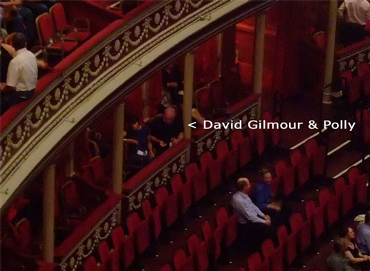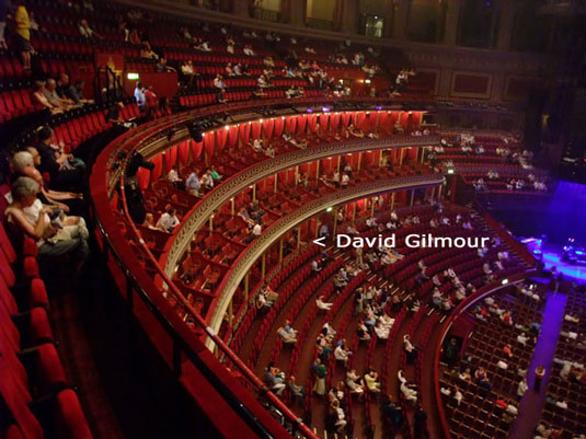 Am Eingang 4 warteten mit vielen Anderen auf Einlass. Als ewig nichts passierte, umrundeten wir die Halle noch mal. Dabei sahen wir am Stageeingang El Magnifico Phil Manzanrea, wie er gerade die Halle betrat. Unsere Hoffnungen stiegen, denn wo Manzanera ist, kann David Gilmour nicht weit sein. Das war dann auch so. 15 Minuten vor Konzertbeginn erreichten wir unsere Plätze im 4. Rang (letzte Reihe ganz oben, andere Tickets gab es nicht mehr, obwohl wir sie schon vor 3 Monaten für 55GBP gekauft hatten). Werners Hinweis, dass David vielleicht das Konzert in einer der Logen verfolgen würde, bewahrheitete sich. Ich fand ihn nach wenigen Augenblicken des Suchens. Er befand ich in einer der Logen mit Polly und weiteren Gästen. Während der Konzertpause verlies er die Loge nicht und ich wollte Paparazzi spielen näher heran gehen, um ihn zu fotografieren. Das blieb mir aber verwährt, man durfte nur den Bereich des Konzerthauses betreten, wofür man Tickets hatte. So blieb es bei sehr wagen “Suchbildern” mit meiner kleinen Knipse, die den großen Abstand mit dem kleinen Zoom nicht überwinden konnte.