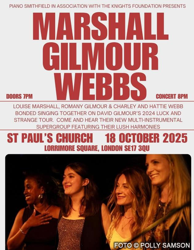 Das Konzert Nummer 5 von Louise Marshall, Romany Gilmour, Hattie und Chaley Webb findet am 18. Oktober statt. Sie werden ein intimes Konzert in der atemberaubenden St. Pauls Church am Lorrimore Square in Kennington in London spielen. Veranstaltet wird das Konzert erneut von Piano Smithfield, die bereits im Juli vier ausverkaufte Debütkonzerte, unter Beobachtung von David Gilmour, Polly Samson und Guy Pratt, für sie in Zusammenarbeit mit der Barry Knights Foundation organisiert und veranstaltet haben.