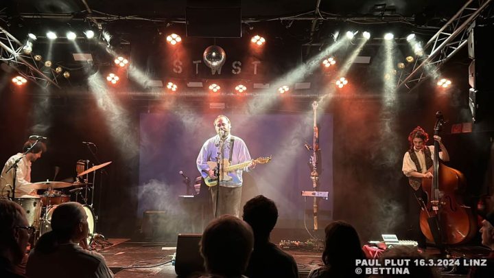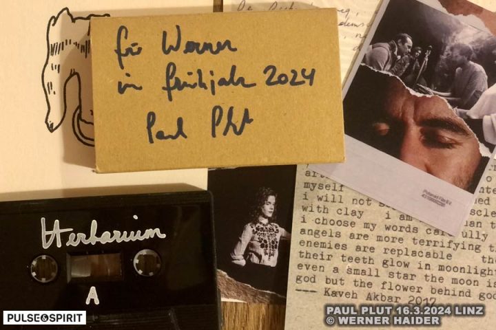 Ein Auftritt von Paul Plut ist etwas Besonderes! Bevor es losgeht, entdeckt man auf seinem Sitzplatz ein Papiertascherl, darin findet man auf Zetteln mit verschiedenen Formaten und darauf würdig zusammengestellte Informationen über das heutige Konzert und Plut’s neues Album Herbarium, das selbstverständlich nur auf Kassette erhältlich ist.