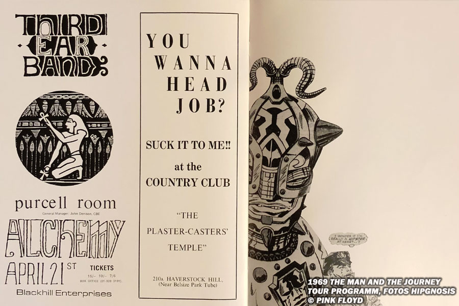 - Performance: former Hornsey art student Peter Dockley roamed the hall clad in a Monster Costume, comprised of a gas mask and fake genitalia attached to a water supply, “urinating” on the crowd, and terrifying one female audience member when he sat down beside her. (Mark Blake Liner notes, 1969 DRAMATIS/ATION)