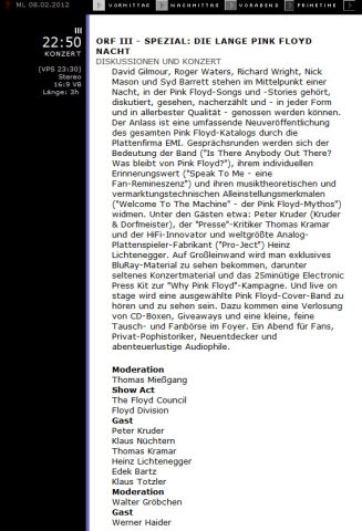 Über die Pink Floyd Night vom 2.2. im RadioKulturhaus habe ich bereits berichtet! Heute ab 22:50 Uhr werden 185 Minuten auf ORF III zu sehen sein! Davor wird eine Pink Floyd Dokumentation, zusammengestellt von Klaus Totzler, zu sehen geben.