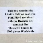 Ein etwas kurioses Stück in meiner Sammlung ist das The Division Bell – Metal Set! Woher ich dieses auf 2000 Stück limitierte Teil habe, das weiß ich heute natürlich nicht mehr. Es scheint mir nicht unbedingt offiziell zu sein. Vielleicht kann sich einer von euch noch genauer daran erinnern! Auf alle Fälle lag im Bauch der Skulpturen die The Division Bell CD Version.
