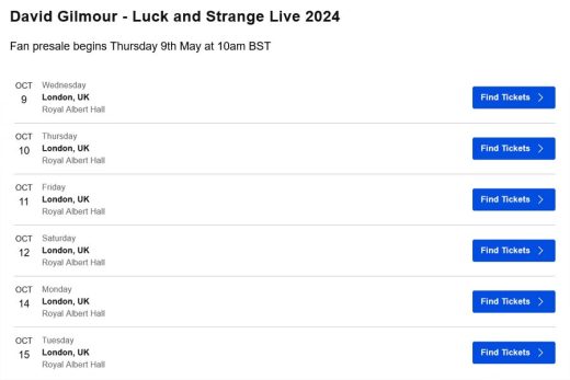 Heute um 11 Uhr startet der offizielle Kartenverkauf für die sechs Konzerte von DAVID GILMOUR in der ROYAL ALBERT HALL. Ich hoffe alle, die...