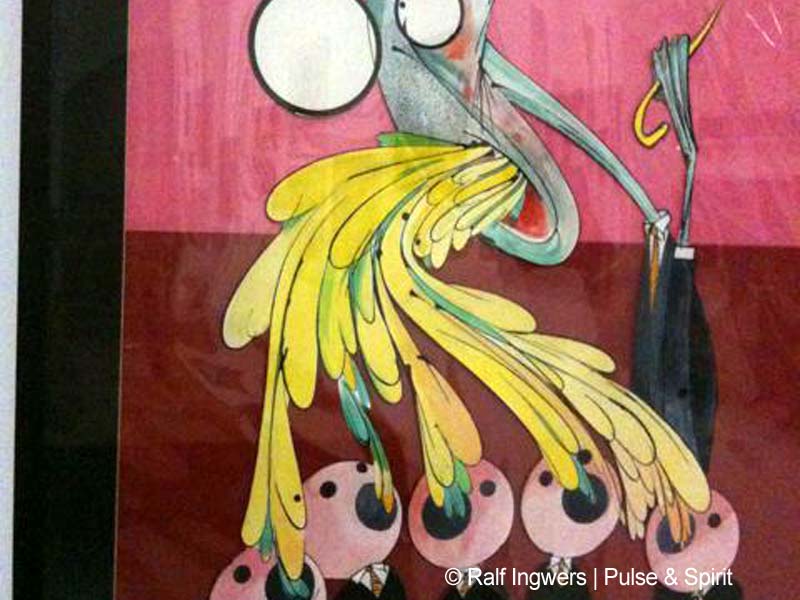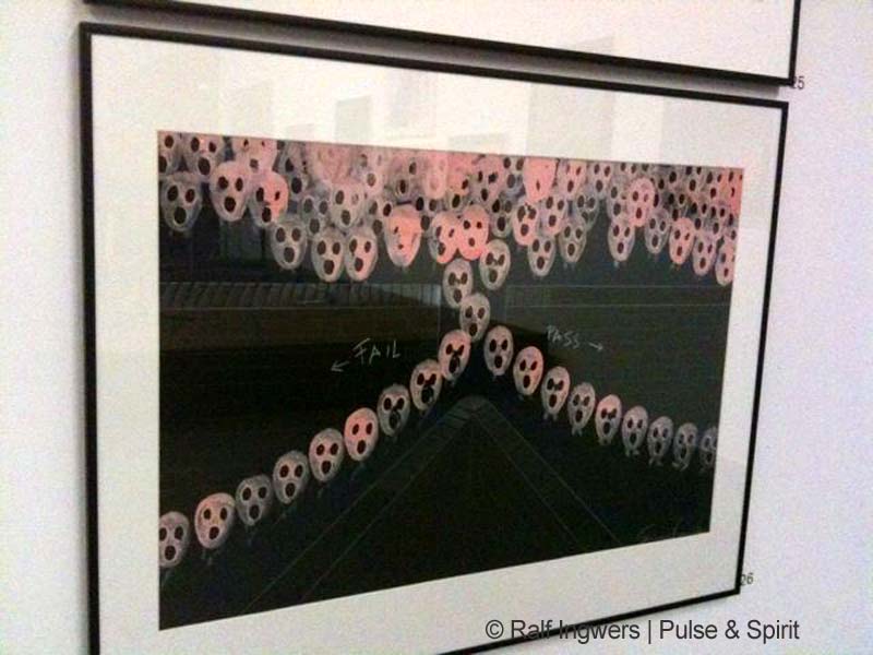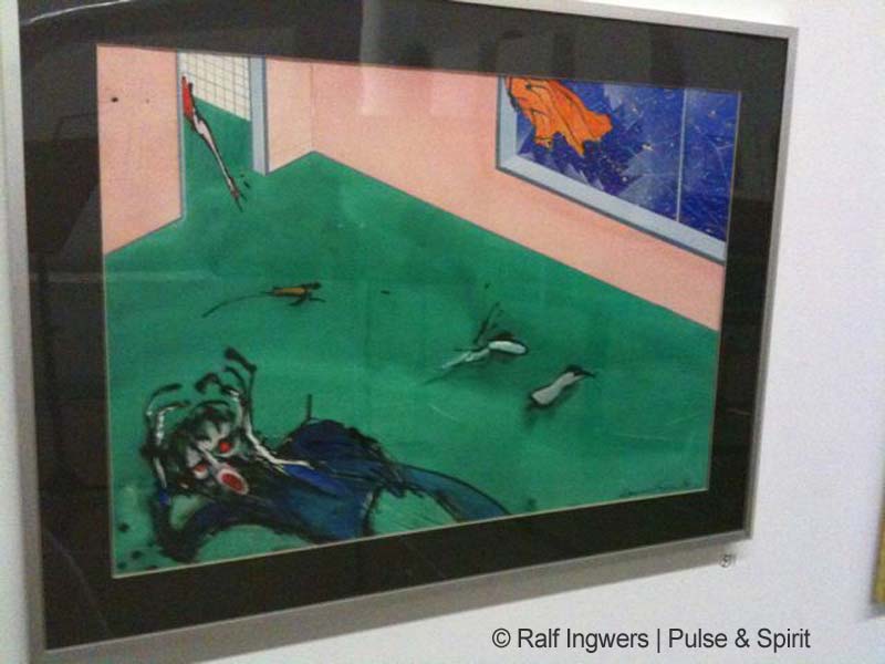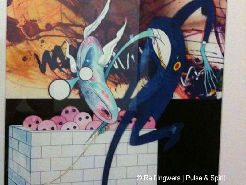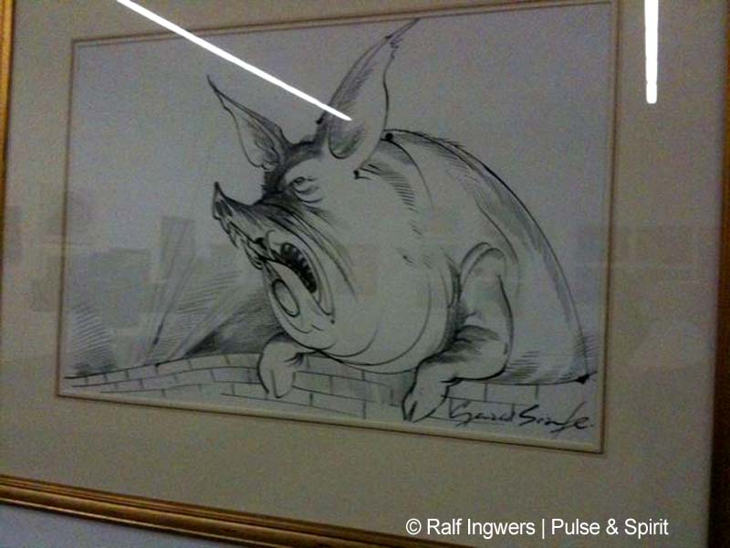 Ich habe mir die Scarfe Ausstellung angesehen. Für mich hat es sich sehr gelohnt, sich die Zeichnungen mal im original anzusehen. Außerdem sind einige Bilder ausgestellt, die ich noch nicht kannte. Vor allem die „nicht floydschen“ Karikaturen waren mit völlig unbekannt. Die Ausstellung selber war allerdings, na sagen wir mal etwas lieblos präsentiert. An manche der riesigen Wände hingen in der Ecke vier Bilder. Vor einer Wand stand ein Podest auf denen Notenständern vor den Exponaten standen. Handwerker waren zum Teil auch am hämmern und klopfen. Fotografieren war kaum möglich. Die Neonbeleuchtung hat übermäßig gespiegelt, was bestimmt auch so beabsichtigt war.